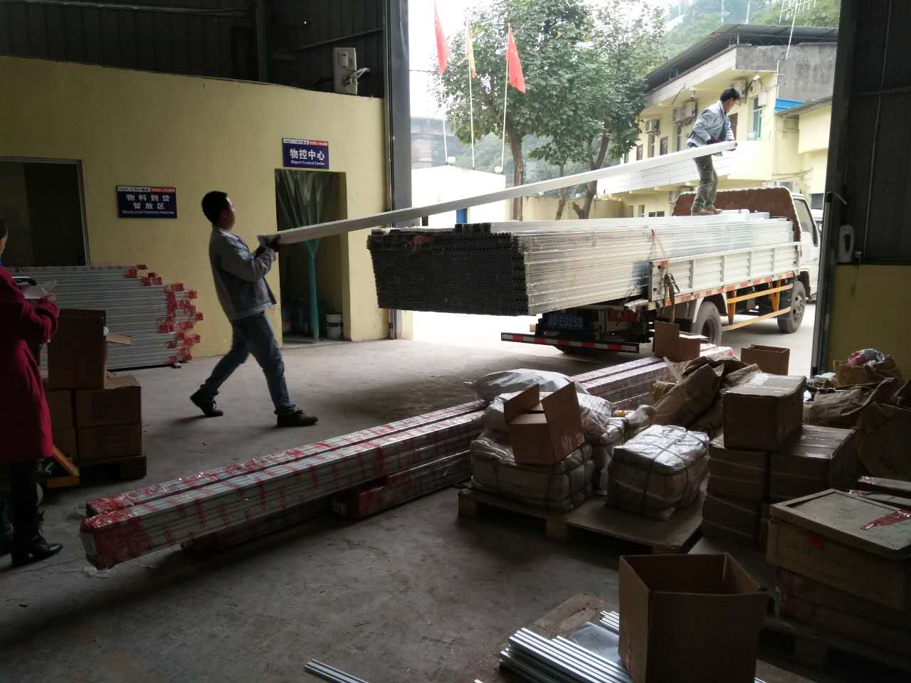 出貨區(qū)堆滿了要待出貨產(chǎn)品,匯利興人將鋁型材轉(zhuǎn)移上車