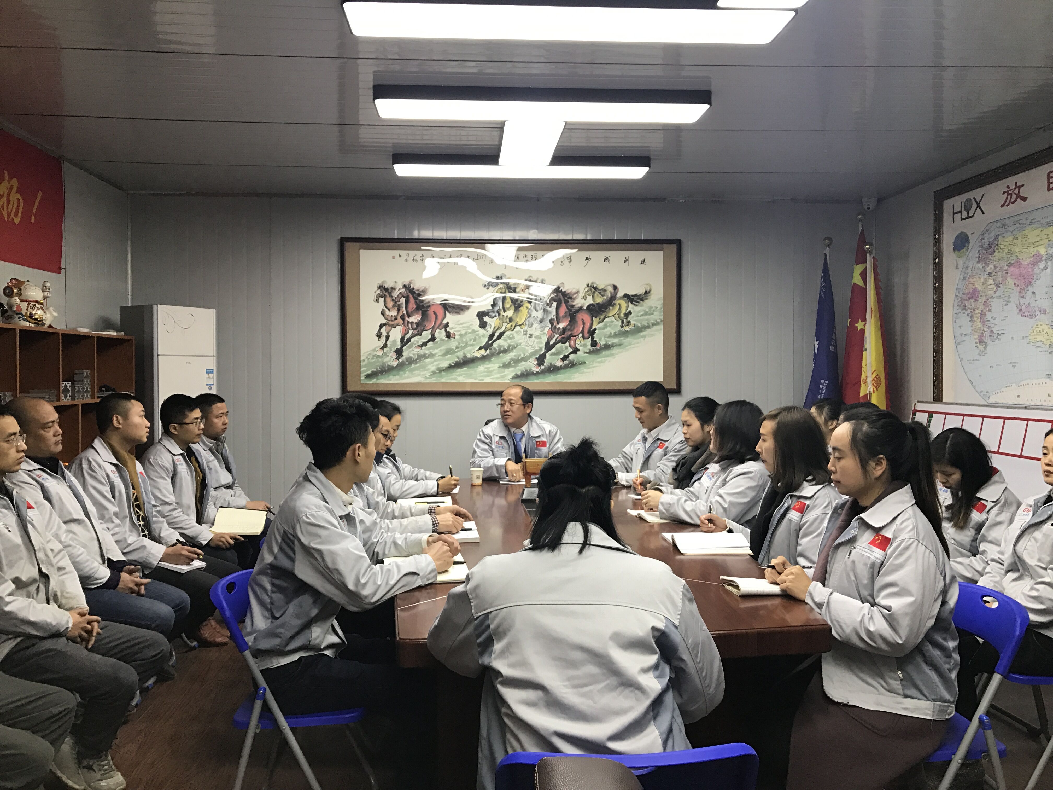 2月27日,匯興智造董事長鐘輝先生蒞臨重慶匯利興子公司考察并指導工作。重慶子公司全體人員對鐘董事長的到來表示熱烈歡迎,并于12點30分由鐘董事長領導召開會議。 鐘董事長在會議上做相應會議的闡述 展望未來、登高望遠。會上,鐘董事長首先提到兩個特質“智慧與力量”,進而談到企業(yè)的擁抱變化及展望未來,并切身實際談到匯興智造所擁抱的變化及所具備的十三大體系的升級(客戶、產品、設備、工具、管理、名字、品牌、宣傳等);進而也公布公司近段時間一系列喜訊事宜并讓我們感受到公司前進步伐的節(jié)奏感及時效感,同時表示國家一系列政策對我司的大力支持與鼓勵,并談及到平臺的力量,品牌的力量”。 全體人員用士氣唱響心中的船(匯利興) 鐘董事長說道:公司”倍增計劃”是以內伸與外延相結合發(fā)展進而勉勵我們:在崗也應在職,在職也應在職,且人因夢想而偉大,以走一步看兩步想三步為理念朝著目標努力奔跑。隨機應變,有配而來,整個會議以“匯利興是我們的船而我們在船上”的吶喊聲兒結束,但那一聲聲強大的聲音滲透在匯利興人每個人的腦海,將永不停歇。