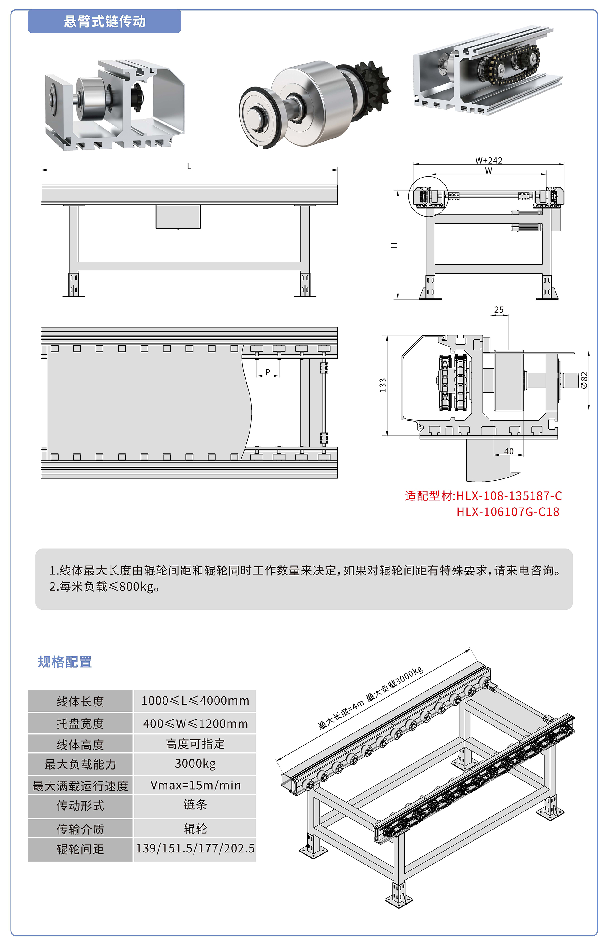 采用135187鋁型材,鏈輪傳動(dòng),鍍鉻滾輪鑲嵌銅套實(shí)現(xiàn)積放功能,負(fù)載3000kg/米,最大負(fù)載速度15M/min, 輪距139、151.5、177、202.5可選,適用托盤寬度400-1200mm,線體長(zhǎng)度范圍1000-4000mm, 高度根據(jù)需求定制.